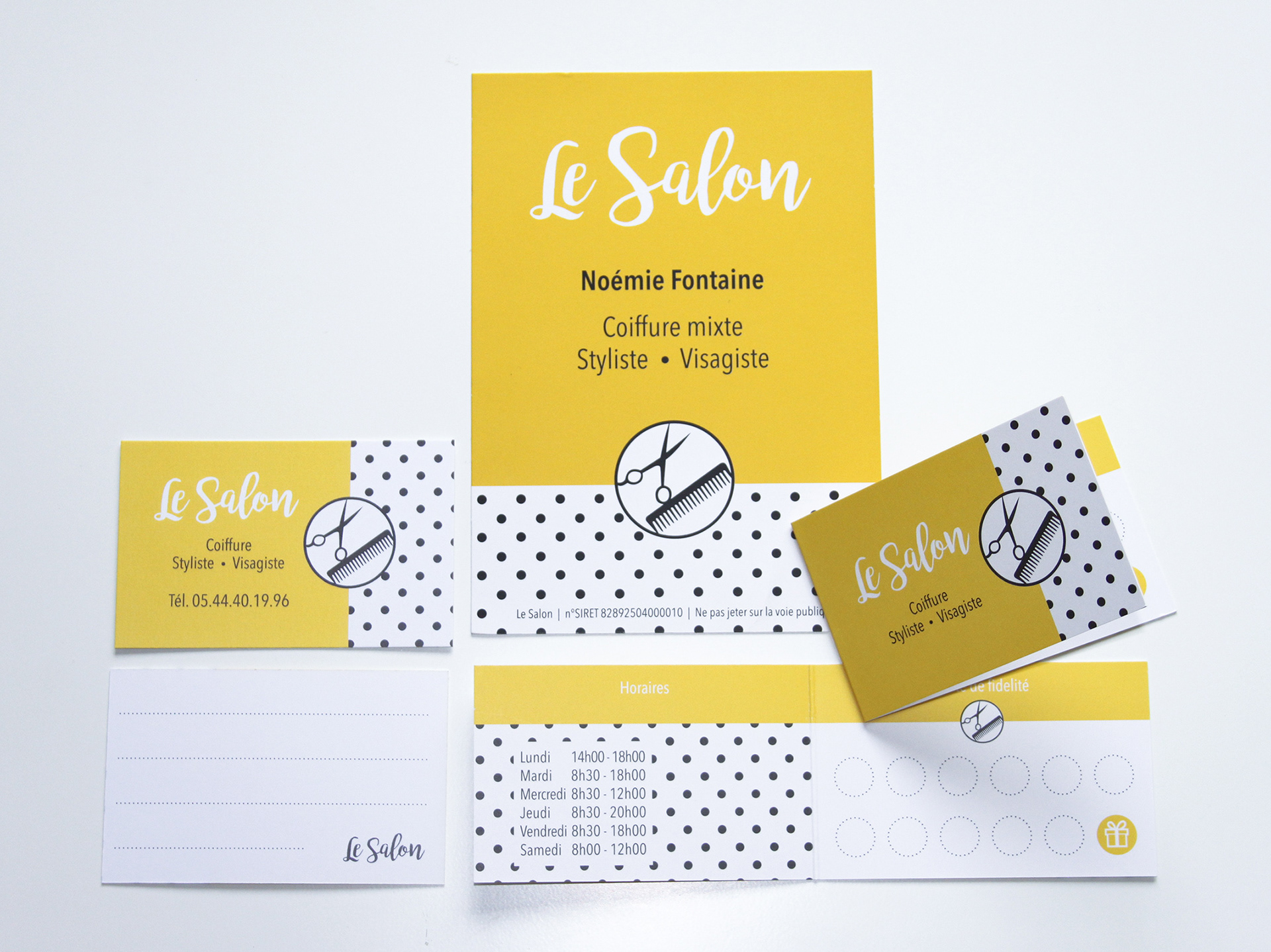 Für den Friseursalon von Noémie Fontaine, der im Juli 2017 in „La Gare de Corrèze“ in Frankreich eröffnet hatte, habe ich mich um die grafische Werbekonzeption gekümmert. Darunter sind beispielsweise Visitenkarten, Preislisten, Stempel, Treuekarten und Termin-Notizzettel.