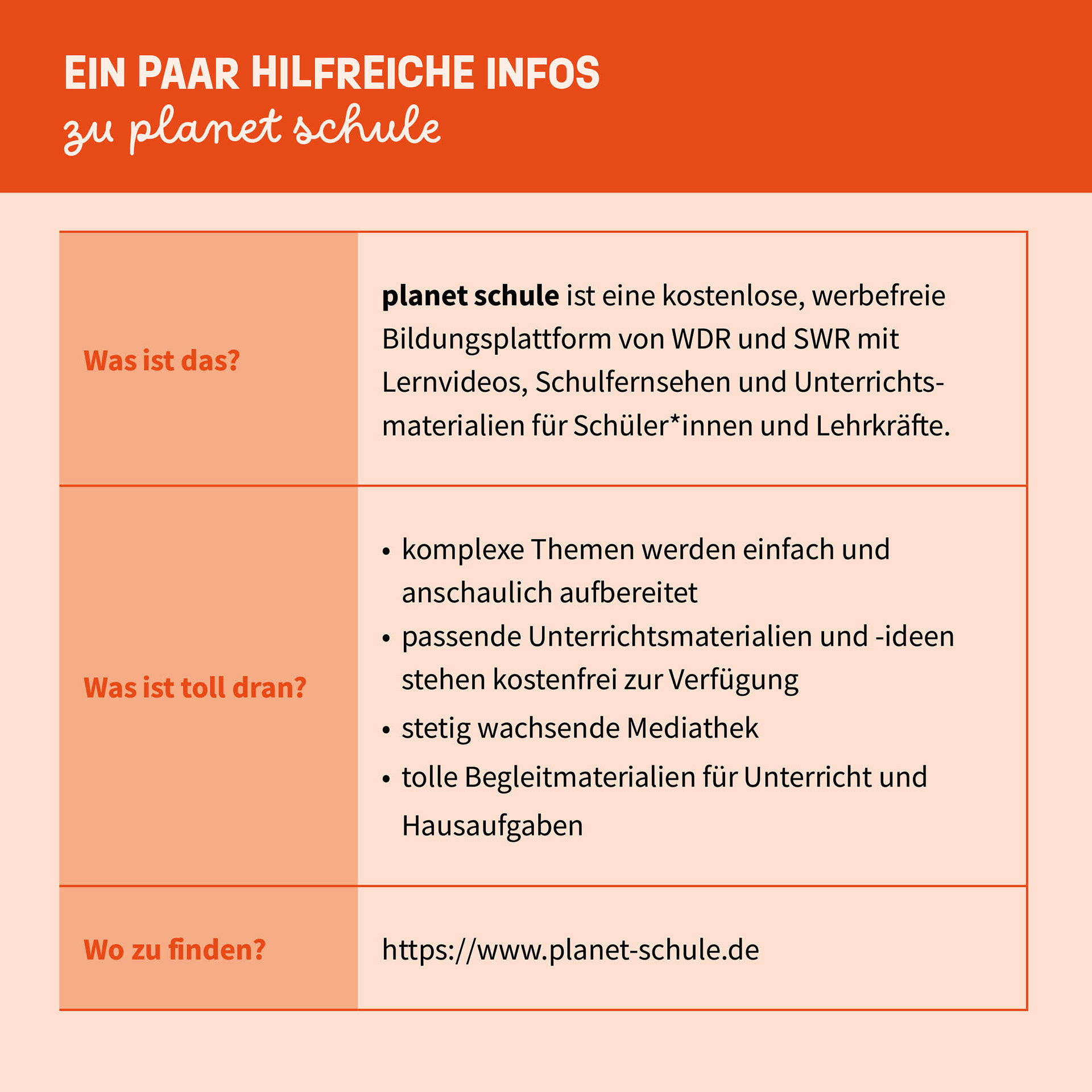 planet schule ist eine kostenlose, werbefreie Bildungsplattform von WDR und SWR mit Lernvideos, Schulfernsehen und Unterrichtsmaterialien für Schüler*innen und Lehrkräfte.