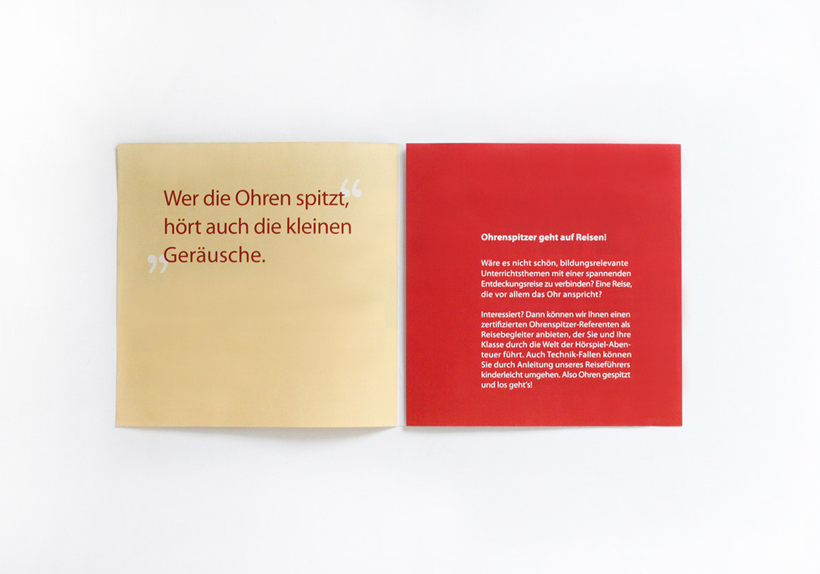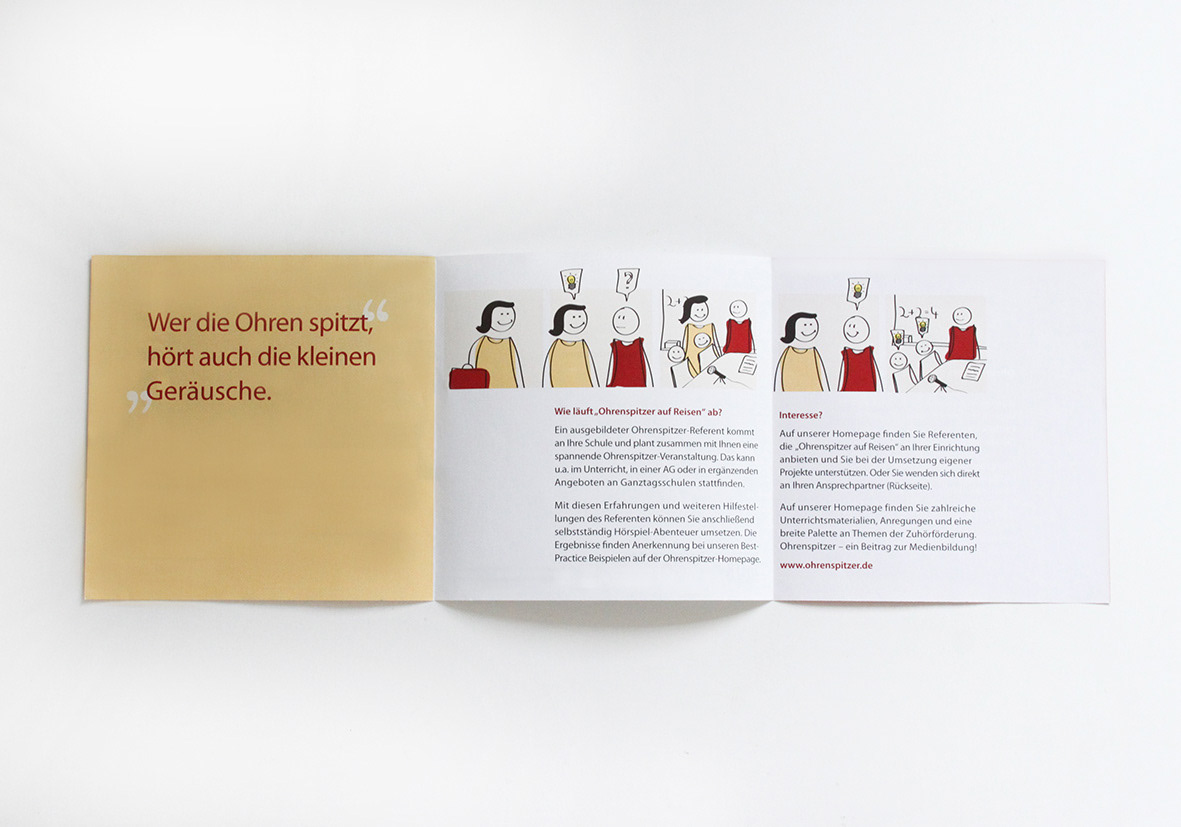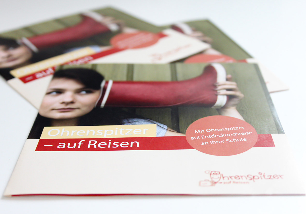Konzeption und Gestaltung eines Flyers für das Projekt Ohrenspitzer. Dieser Wickelfalz (ineinander geschlagener Flyer) bewirbt in einem handlichen Taschenformat die Projektreihe „Ohrenspitzer auf Reisen“.
